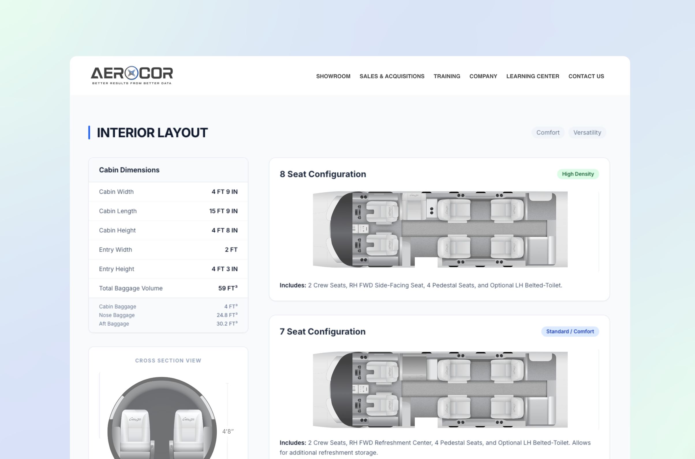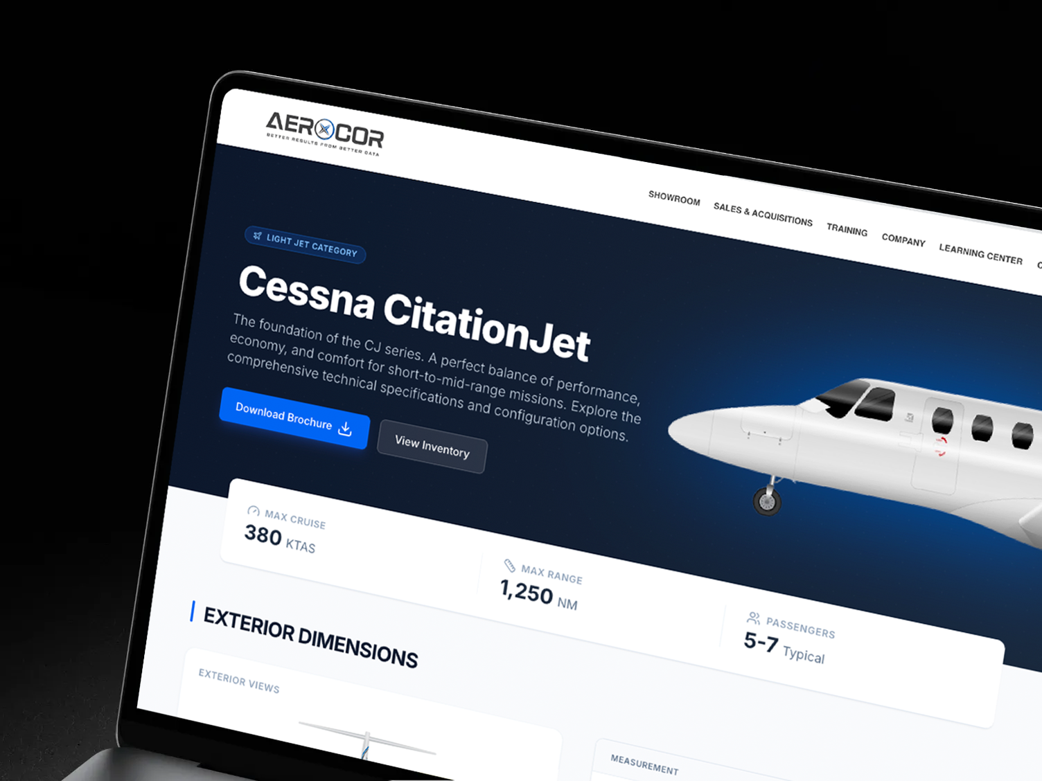 Purchasing or selling a light jet is a highly complex, high-stakes process that requires deep technical and market knowledge. Aerocor recognized the need to empower their clients with an educational hub—the Learning Center—designed specifically for jet buyers and sellers. The goal of this project was to demystify aircraft ownership and sales, transforming dense aviation data into an accessible, engaging, and premium digital experience.